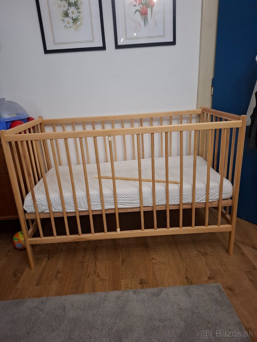 Detská postieľka Ikea Hensvik+ matrac - [4.2. 2026]Predám detskú postieľku (124/65 cm) s matracom (120/60cm) po jednom dieťati. Postieľka už má nejakú tú odreninu (viď foto), ale inak je v perfektnom stave. Matrac je tiež v dobrom stave, je to kokos z oboch strán v strede molitan, hrúbka cca 6 cm. Postieľka je vyčistená a matrac dezinfikovaný. Posti ...