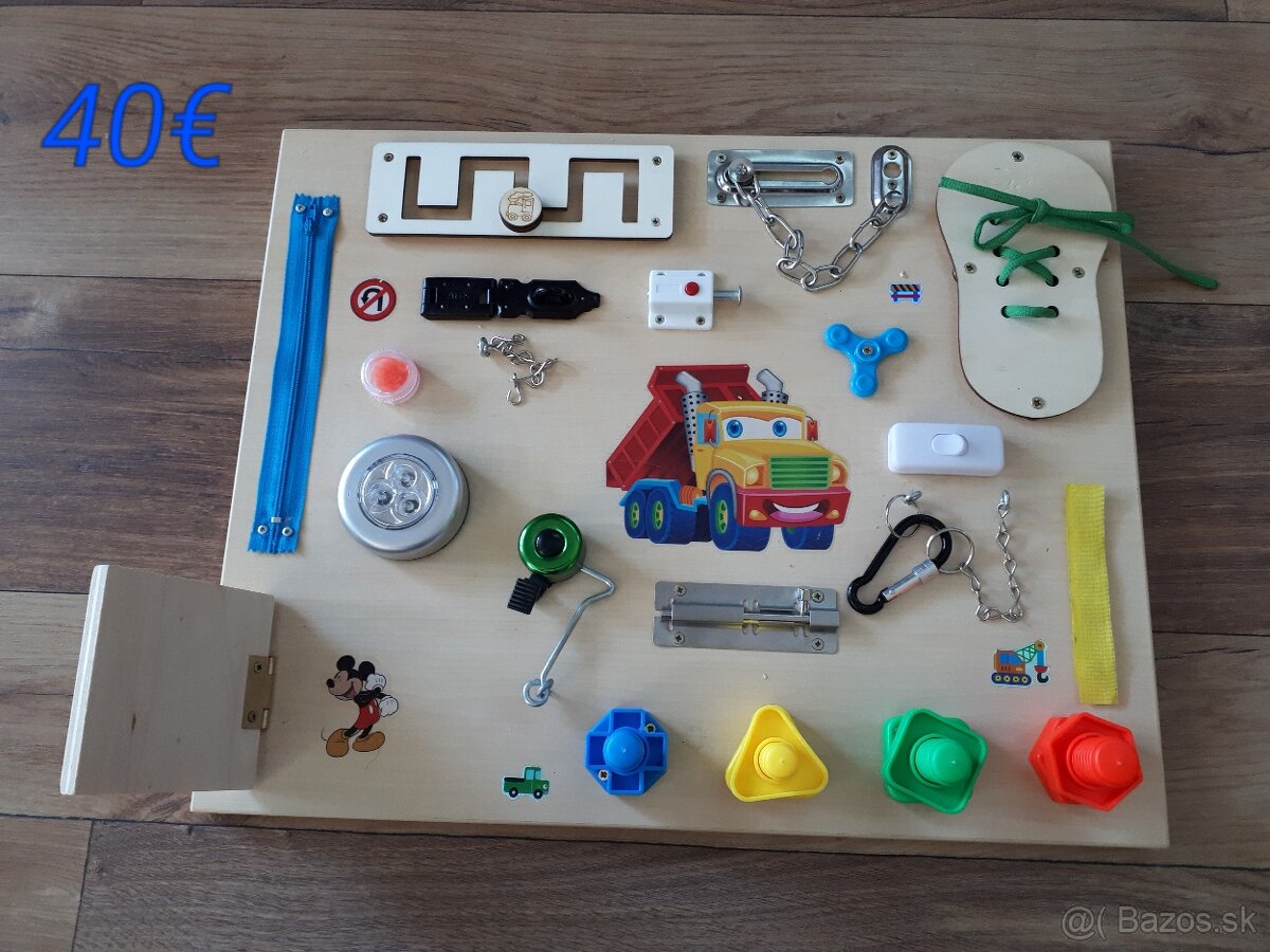 Activity board - [12.2. 2026]Podporuje rozvoj zmyslov a zručností u detí. Všetko funkčné, svetlo svieti, na praktickom stojane. Pôvodná cena 130.