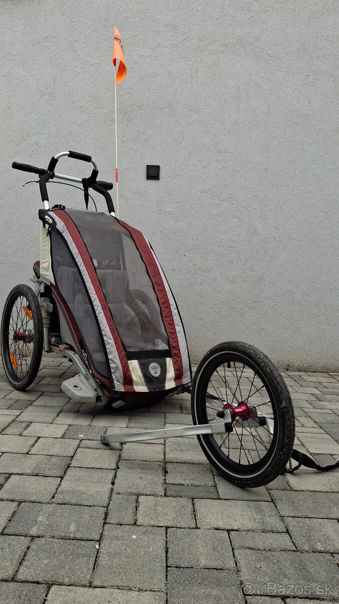 Predam cyklovozik Chariot v multikombinacii pre jogging a bike. K tomu dodatocny uchyt na druhy bajk (samostatne cena 65 EUR) a predlzenu osku na zadne koleso bajku (thru-axle). Pridavam aj nahlavnik pre dieta ked zaspi. Vsetko super stav.