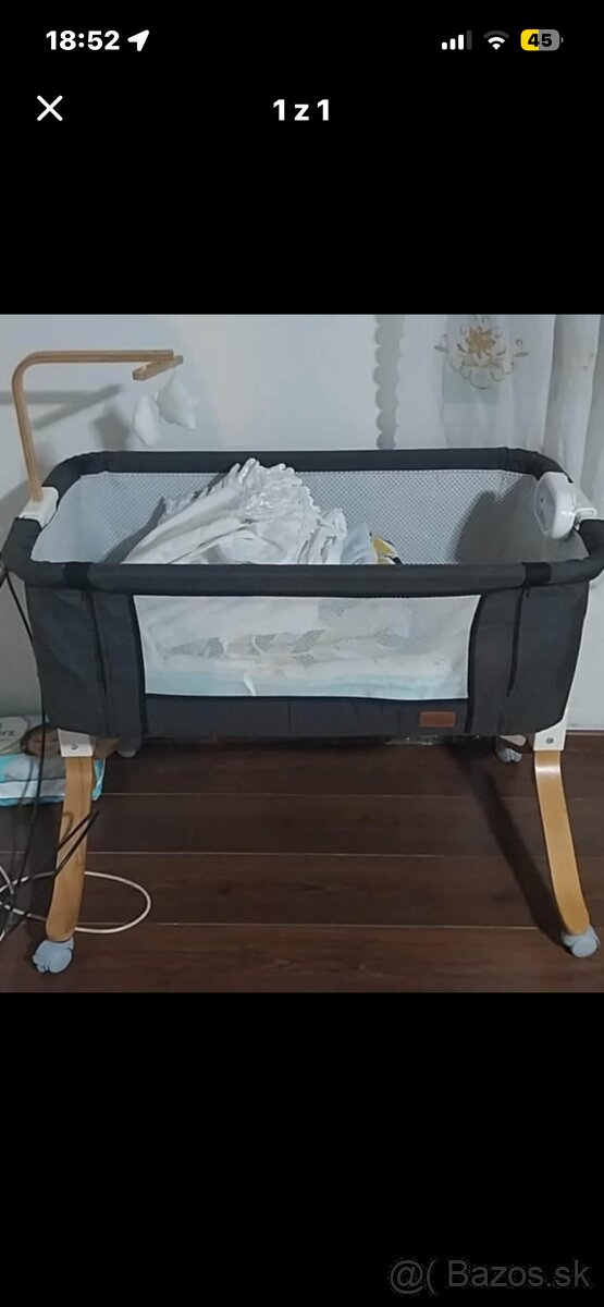Predám detskú postieľku značky Wellgro v peknom stave.Postieľka je používaná ale zachovalá a plne funkčná je na kolieskach takže ju môžete v byte jednoducho presúvať podľa potreby.Čo je súčasťou:Postieľka,matrac a držiak/konštrukcia na kolotoč.Čo nie je súčasťou:Hračky ktoré viseli na kolotoči(dcéra ich úspešne strhla😅) a ostatné dekorácie.Materiál:Polyester a drevené nohy.Maximálna nosnosť:do 18 kg.Rozmery postieľky:96cmx57 cm x 89 cm.Matrac:Súčasťou je matrac s rozmermi 86 cm x 53 cm a hrúbkou 35 mm.Vlastnosti:Bočnica sa dá otvoriť (predĺženie 66 cm x 34 cm)čo uľahčuje prístup k bábätku.Hĺbka postieľky:32cm.Len osobný odber!Veľké Blahovo v prípade záujmu ma kontaktujte v správe