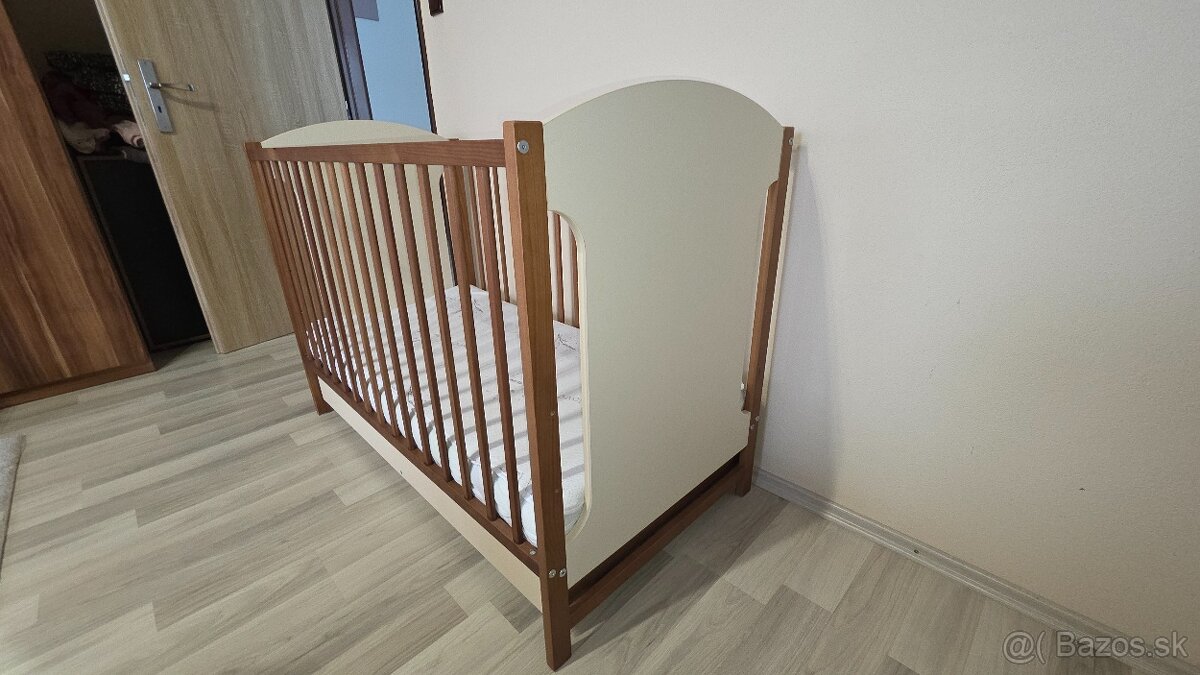 Predám detskú postieľku vo farbe orech/biela. V spodnej časti výsuvný šuflík. Výšku matraca možno nastavit v 3 úrovniach.
