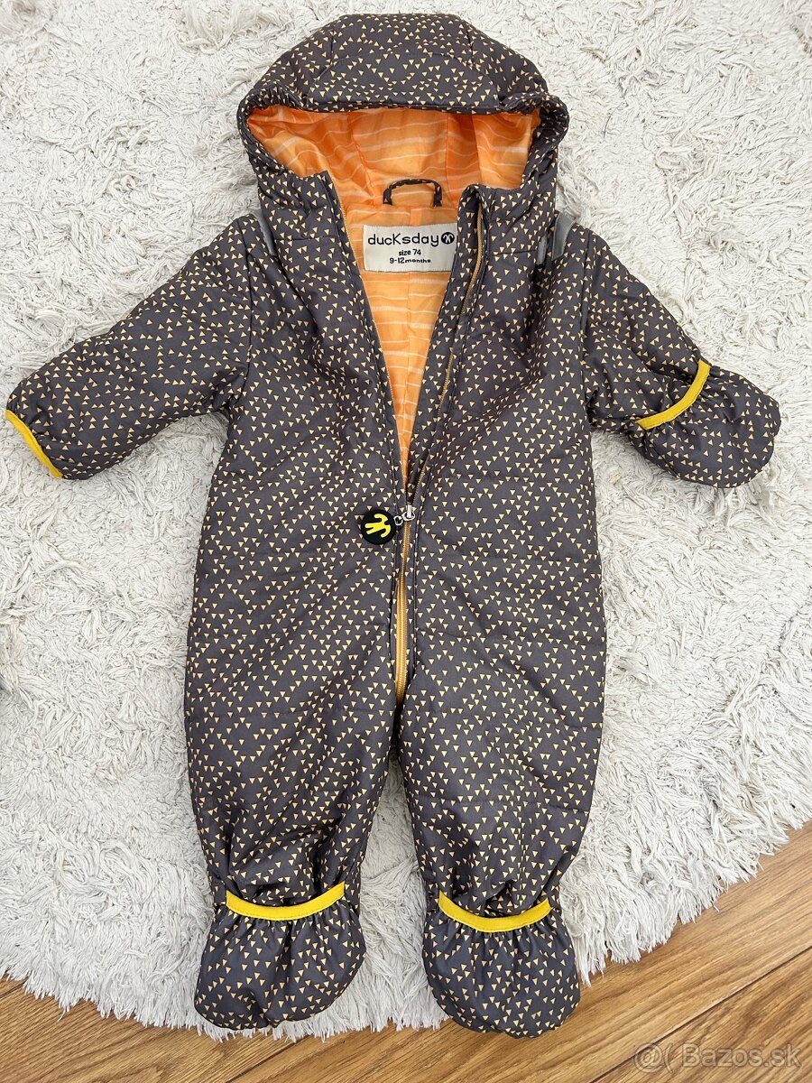 Predám chlapčenský overal Ducksday veľkosť 74, kúpený vo Feedo za originál cenu 80€, je v perfektnom stave, s patentmi na rukách aj nohách takže sa dajú zahnúť a schovať rúčky a nožičky (bez potreby nosenia rukavíc či topánok), neprefuk a nepremok, dá sa nosiť už od veľkosti 68 a znestí sa pod neho viac vrstiev oblečenia. Ako nový.