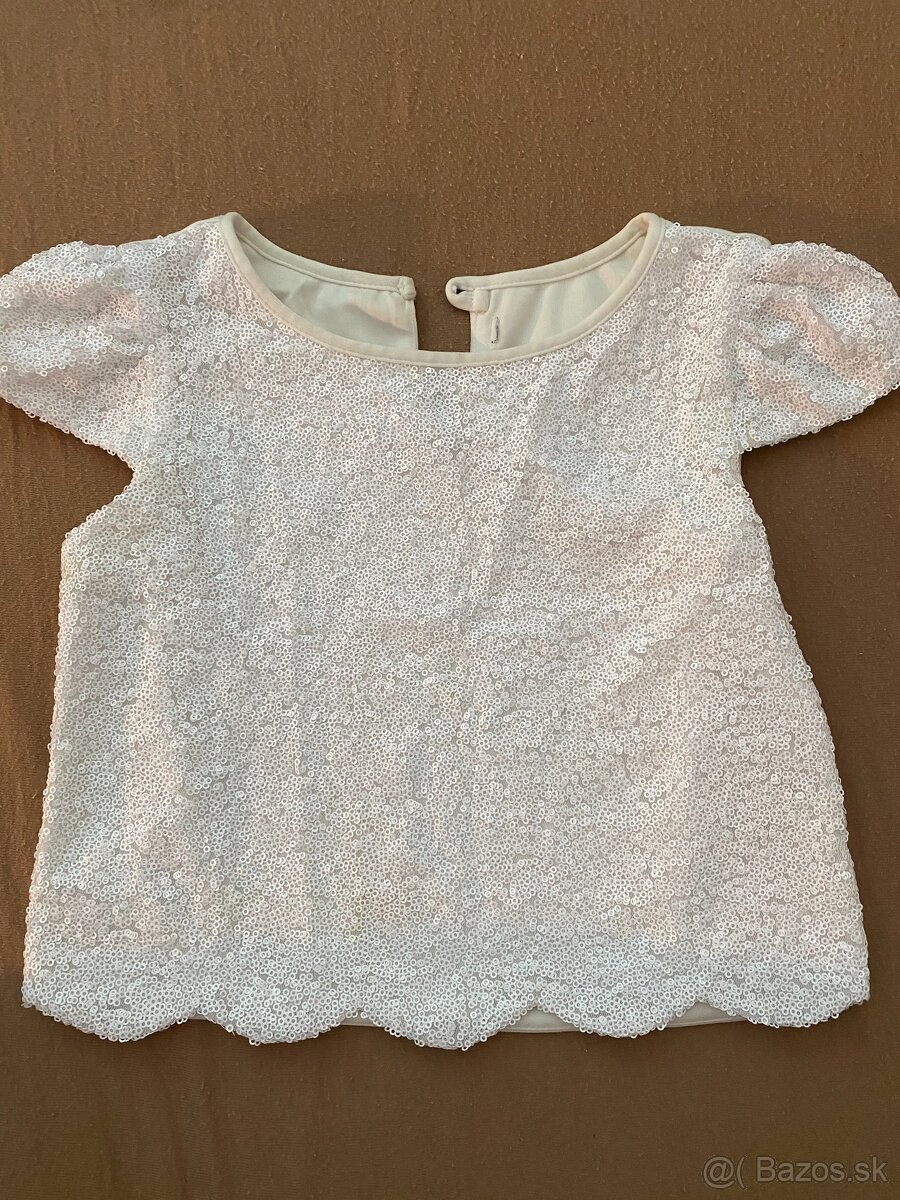 Dievčenské biele krátke tričko z 2-vrstvového materiálu. predná strana je celá zdobená drobnými bielymi flitrami. Dĺžka trička je vzadu 33cm.