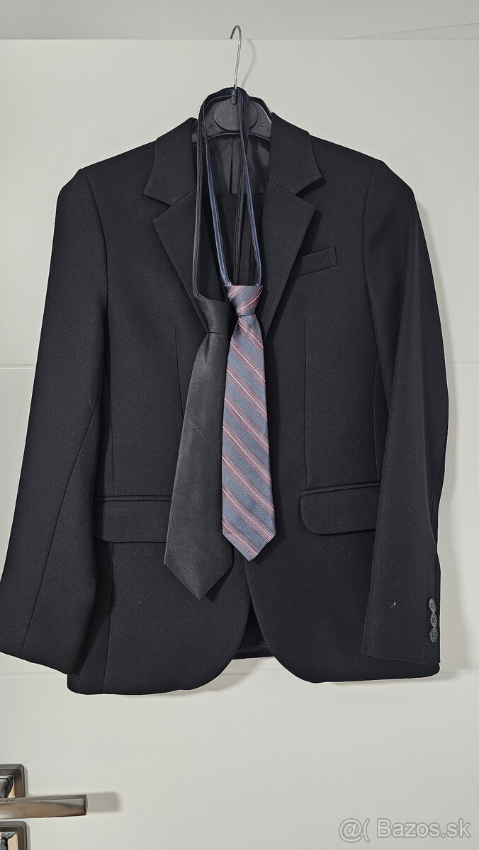 Predám čierny oblek s košeľou pre chlapca – vek cca 9-12 rokov, podľa výšky, veľkosť 152. Rozmery cca: Sako rozmer zadnej časti dĺžka 67cm, šírka: plecia 35 cm, pás 44 cm, rukáv 57 cm. Nohavice prispôsobivý pás: max. 39cm x2, dĺžka nohavice – vonkajšia 87cm, vnútorná 67cm. Biela košeľa veľkosť 36, na 158 cm. Cena za celý komplet 20 €, Žilina, len osobný odber.
