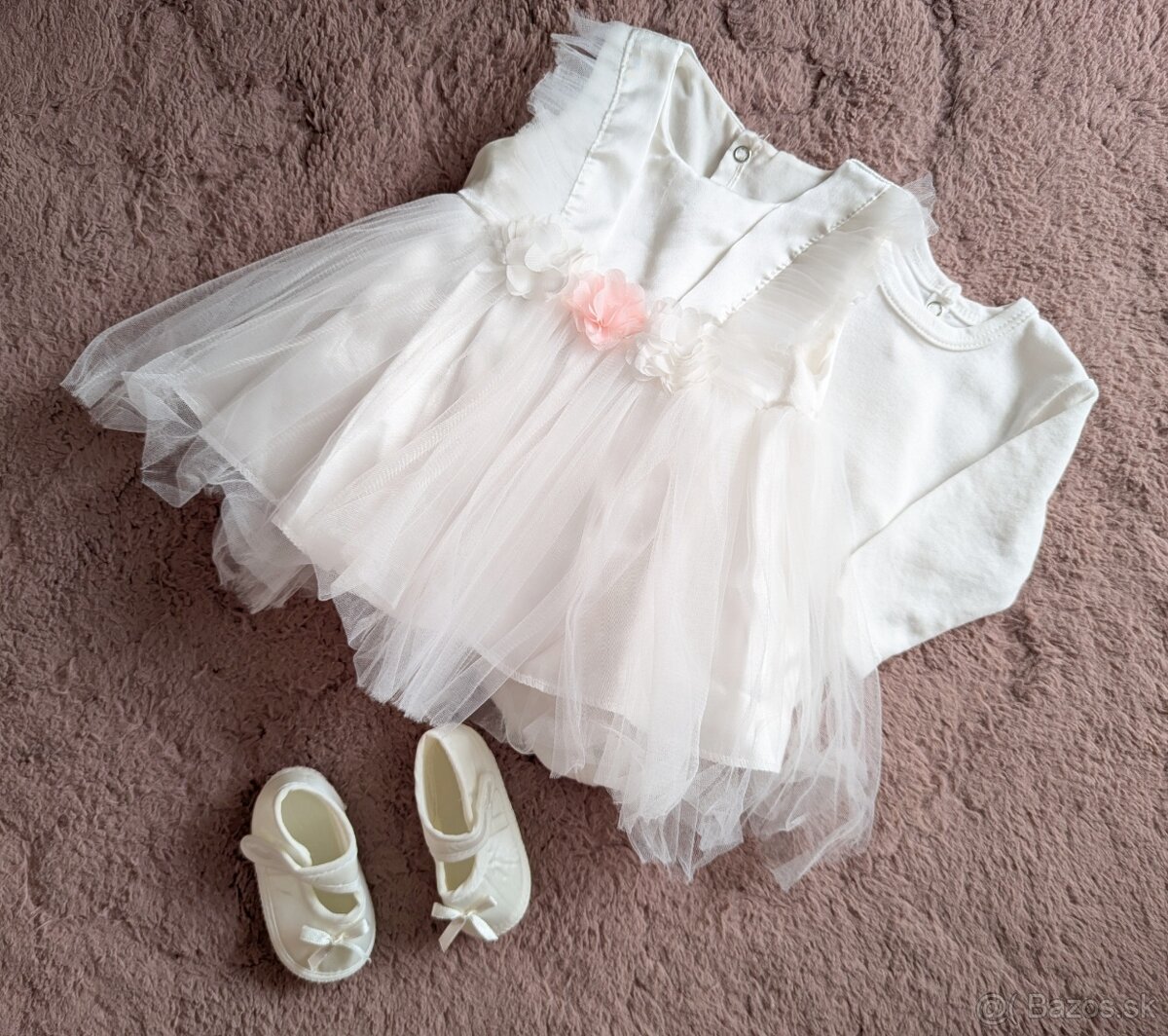 Dievčenský set na krstiny - obsahuje krásne šatky s tylovou sukničkou a kvetinovou aplikáciou, biele body s dlhým rukávom a topánočky. Veľkosť 62, oblečené 1x (body iba vyprané), v top stave. V prípade záujmu viem dopasovať aj svetrík.