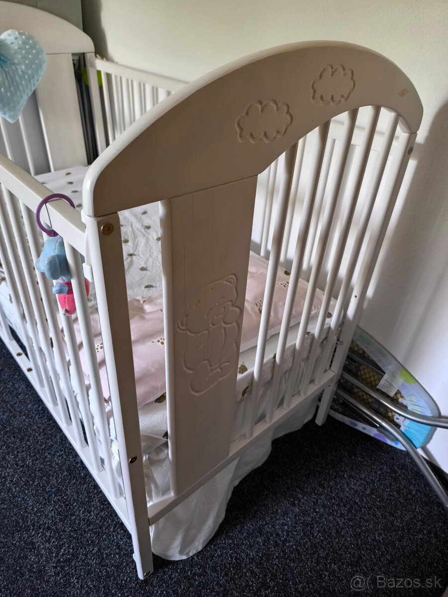 Detská postielka - [7.2. 2026]Predám detskú postieľku značky Drewex bielej farby. Jedna strana je sťahovacia. Matrac sa dá výškovo nastaviť do troch úrovní. Priateľ na ňu namontoval kolieska, takže si postieľku môžete akokoľvek presúvať. Cena vrátane matraca.