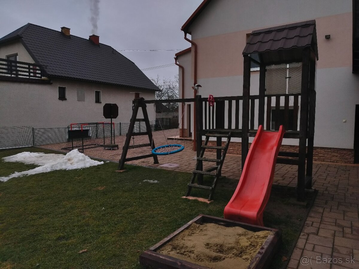 Predám záhradný domček plus pieskovisko. Na domčeku je 2m šmýkačka, hojdacie hniezdo, lezecké lano, detská hojdačka, kormidlo a hojdačka na lane. Domček sa dá aj rozobrať. Dosky na podeste je treba vymeniť.