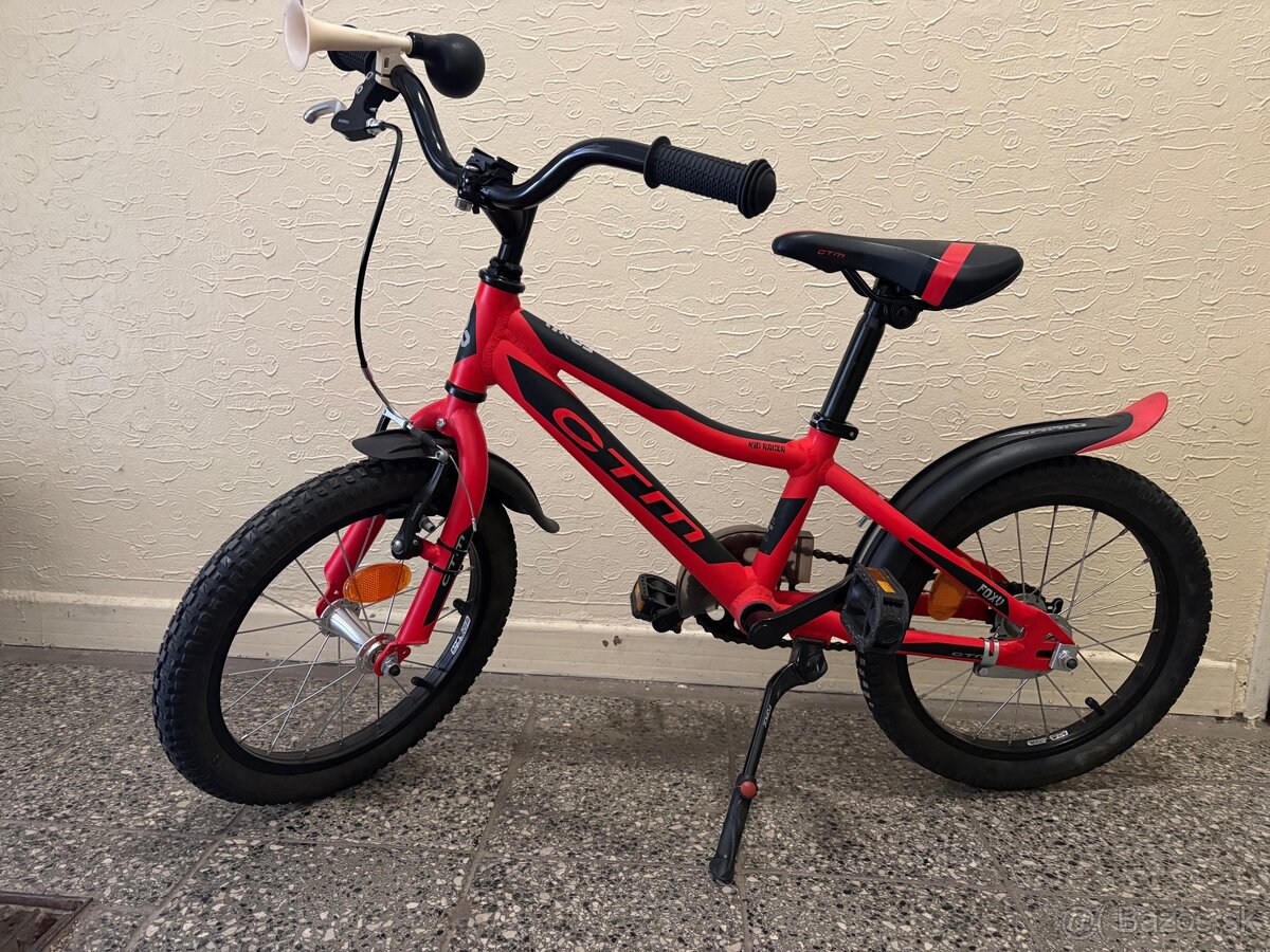 Predám zachovalý detsky bicykel CTM Foxy, veľkosť 16, dezén na pneumatikách vo veľmi dobrom stave, blatníky, stojan. Dohoda pri rýchlom jednaní + nový tachometer v cene.