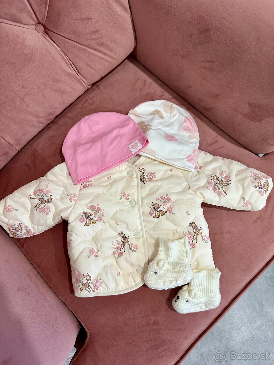 Predám krásnu, tepľučkú, dievčenskú bundu so vzorom Bambi 💕 K vetrovke darujem 2 čiapočky a jedne teplé capačky. Oblečené 1x, nepoškodené, úplne ako nové.