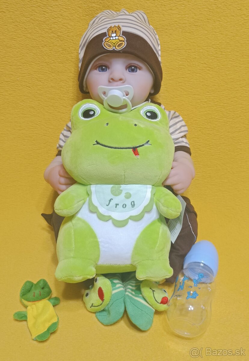 Na predaj realistický chlapec s pohlavím Gabko 48cm. Celotelovy vinyl. Súčasťou je magnetický cumeľ, plienka, kojenecká fľaška, kombinéza, 2x čiapočka, tričko, nohavice a ponožky žabky. Darček naviac je plyšová žabka, maňuška na prst žabka a plyšová peňaženka. Cena 65€