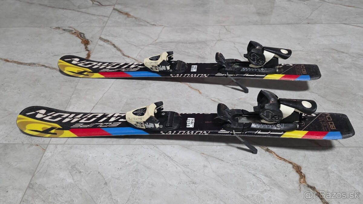 Predám kvalitné detské lyže Salomon Equipe, dĺžka 80 cm, vrátane originálneho viazania Salomon. Lyže sú po servise ihneď pripravené na svah.