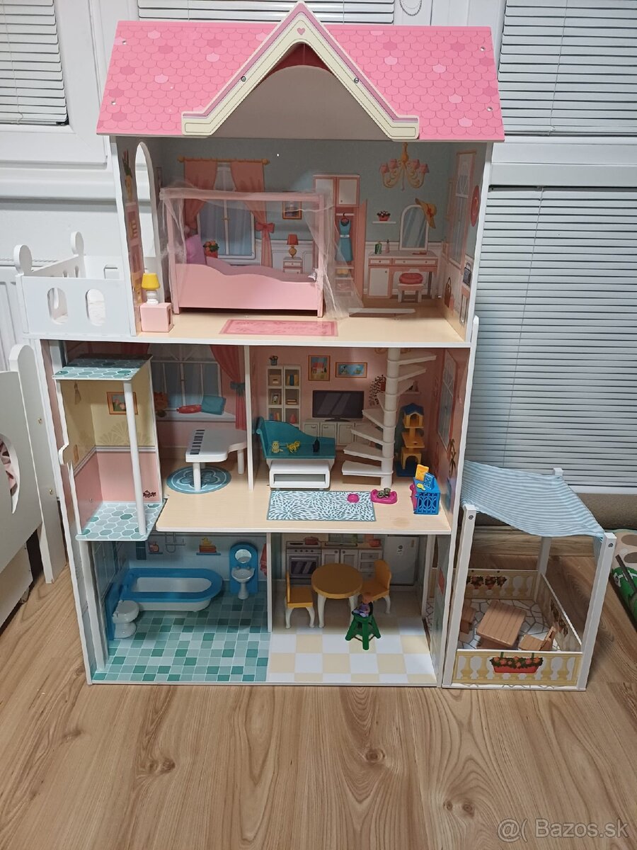 Krásny ružový 3 poschodový domček pre bábiky. Vo všetkých poschodiach sa nachádzajú zariadené miestnosti. Nájdeš tu aj terasu s vonkajším sedením, kuchyňu či kúpeľnu s vaňou. V obývačke si bábika môže zahrať na klavír alebo sa môže pokochať výhľadom z balkóna. Rozmery 75x120x39 cm