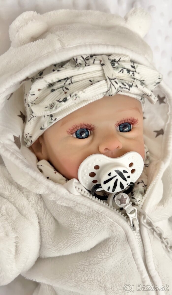 Predám realistickú bábiku, meria 49 cm, váži 1700 g. Bábika má maľované vlásky, modré očká s mihalníčkami a dudlík na magnet . Posielam oblečenú ako na fotke, pribalím je náhradný cumlík, pyžamko a fľašku. V náručí pripomína živé bábätko.