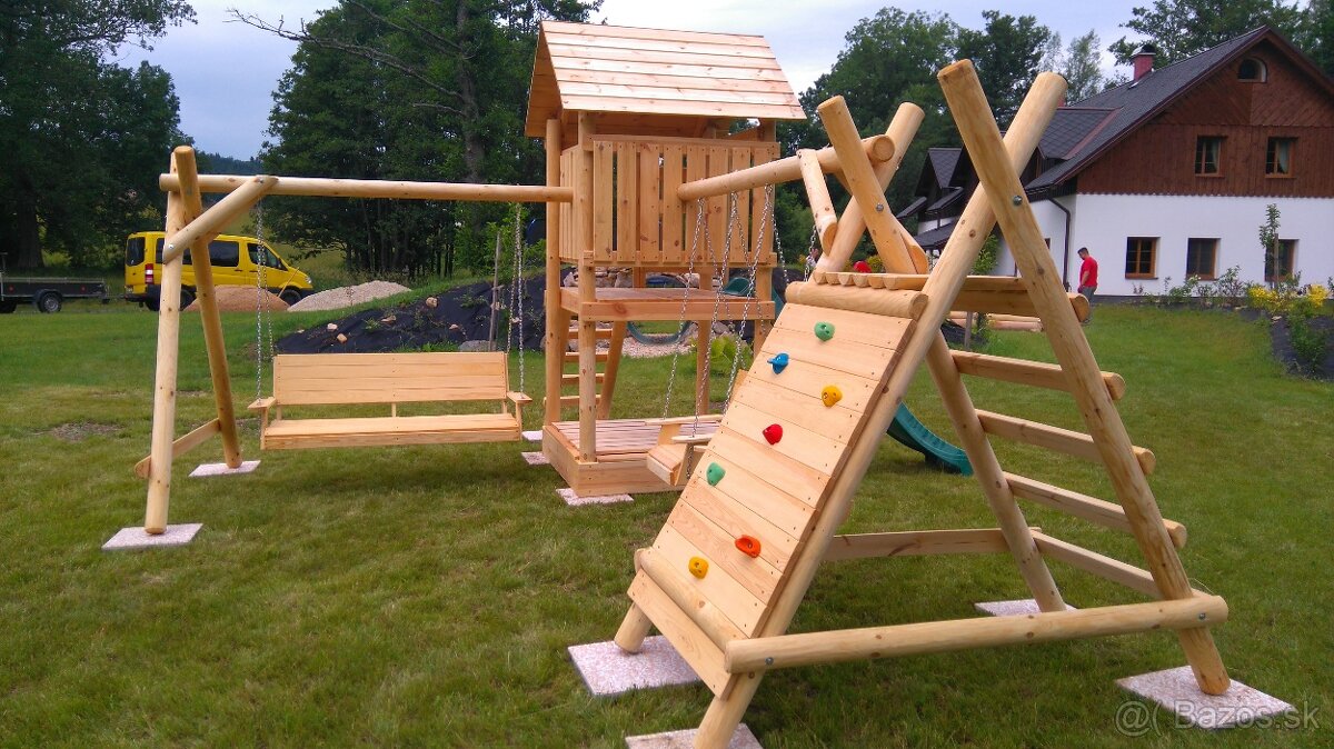 Ihrisko do tvaru "L", nové z masívu borovice odolné vyššiemu zaťaženiu s hojdacou lavicou pre dospelých a nosnosťou 250kg! Dodanie vrátane šmýkačky, hojdačiek, veže, lezecké steny a zakrytie pieskoviska v surovom stave ako je vyobrazené. Žiadna hromada dreva a skrutiek s návodom na palete. Rozmery: základňa veže cca130x130cm, výška 300cm, rozmery plochy ihriska cca 6x6metra. Kompletná montáž na určené miesto možná. Žiadne dosky z hobby marketu, ani ostré hranoly, ale masívna guľatina priemer 10cm!! Originálne ihrisko vhodné pre rodinné domy, penzióny, chaty, atď... Doprava na Vašu adresu po celej SK! Všetky informácie kedykoľvek na telefóne.