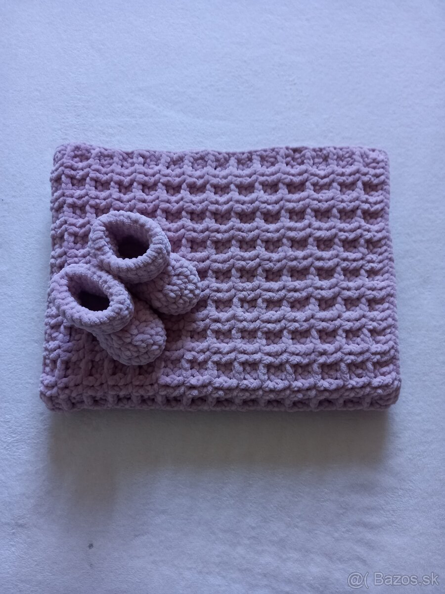 Predam hackovanu detsku deku s waflovym vzorom v peknej ruzovej farbe. Vyrobena z dolphin baby, je makkucka a hrejiva vhodna pre babatka. Rozmer 60x80cm. K deke su papucky v rovnakej farbe. Cena 35eur
