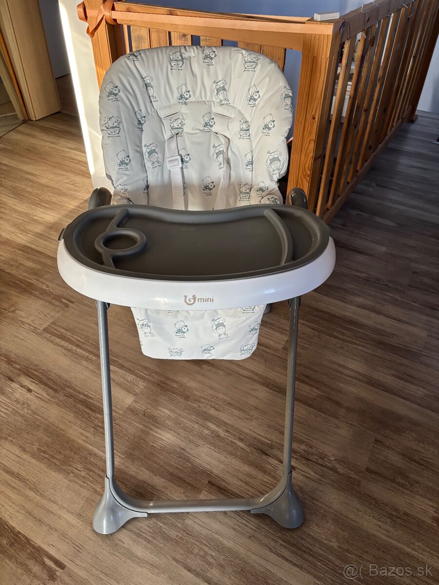 Nastaviteľné operadlo v 4 polohách, nastaviteľná výška stoličky, nastaviteľná výška misky - vždy v optimálnej vzdialenosti od dieťaťa, 4 kolieska, mobilné s brzdou. Stolička je v top stave, bez škrabancov a bez poškodenia poťahu.