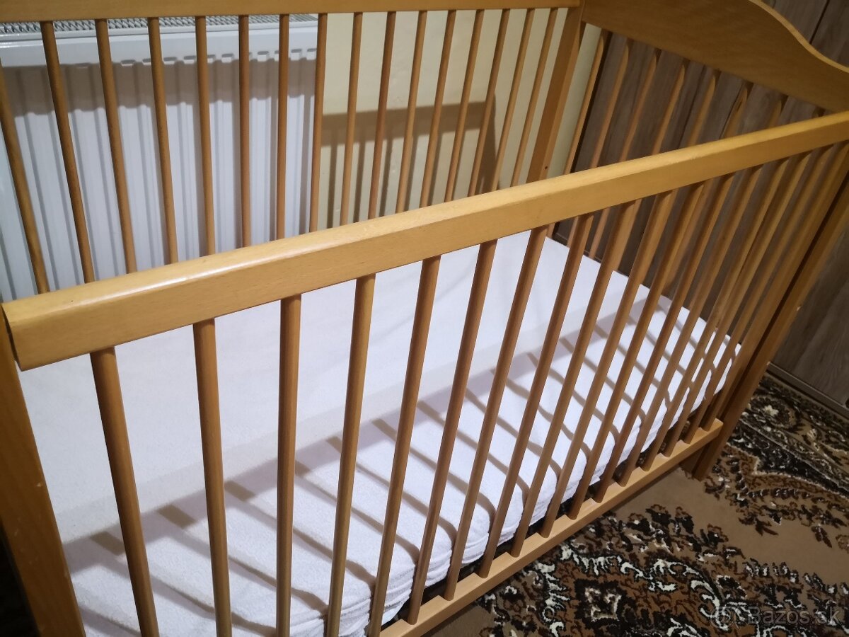 Predám drevenú detskú postieľku. Matrac a plachty v cene.