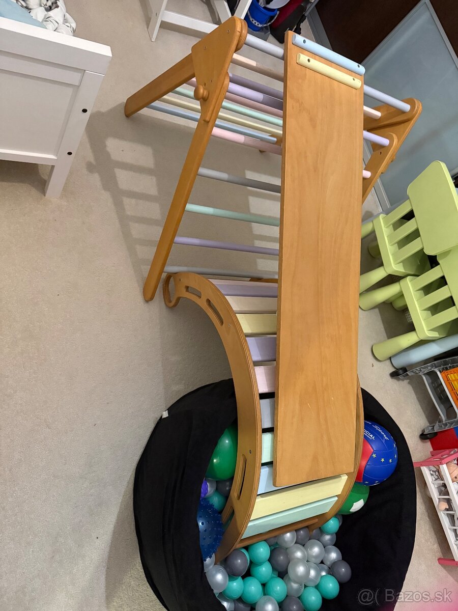 Drevené vnútorné ihrisko pre deti - rebrík, šmykľavka, lezecký oblúk/hojdačka a Piklerov trojuholník a bazén s gulickami (cca 200ks).