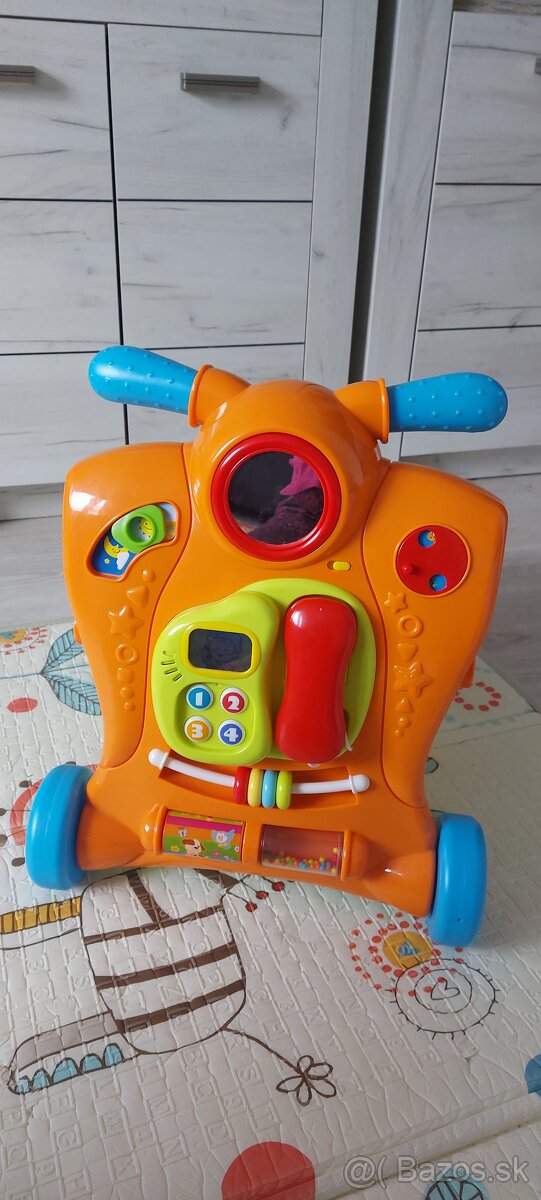 Predám chodítko 2 v 1, ľahké na manipuláciu, ako aj na skladanie. Veľmi málo používané. Má dve polohy - MOTORKA - odrážadlo - dieťa si môže sadnúť a voziť sa, a CHODÍTKO na tlačenie. Predná časť je veľmi zaujímavá z hľadiska rozvoja motoriky, nakoľko má viacero súčastí na hranie - telefón so slúchadlom na batérie, farebné obrázkové valčeky, farebné kolieska na posúvanie, koliesko s úchytkou na točenie, zrkadielko - viď priložené fotografie.