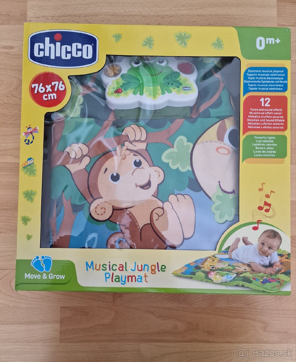 Predám kvalitnú málo používanú hraciu podložku od CHICCO (jungle) s krabicou, podložka ma zvukové fekty. Hracia podložka má rozmery 76 x 76 cm. Vhodná pre deti od 0 mesiacov. Po vybratí zvukovej jednotky sa podložka môže na jemnom programe oprať.