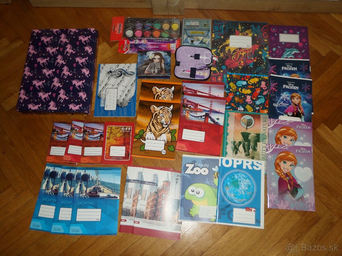 Predám školské potreby čo sú na obrázku-veľké dosky,zošity,vodové farby,zápisníky,ceruzky,manikúra.Všetko je nové.