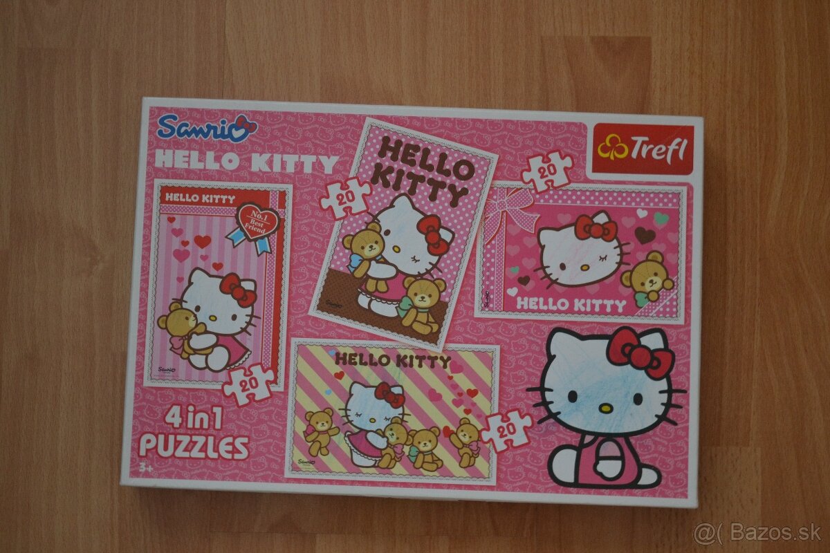 Predám puzzle Hello Kitty, sú to 4 obrázky, ktoré sú rozlíšené na druhej strane. Jeden obrázok má 20ks puzzle. 1ks puzzle je z druhej strany natrhnutý, viď. foto, zlepené lepiacou páskou. Cena + poštovné, osobný odber BA.