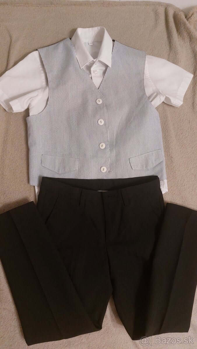 Predam slavnostny set pre chlapca, velkost 122/128. Obsajuje bielu koselu s kratkym rukavom, vestu a cierne nohavice.