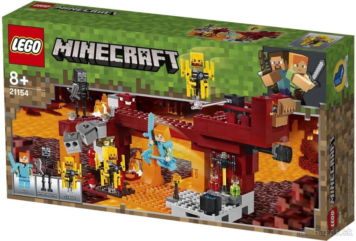Vyraz na dobrodružstvo do sveta Minecraft, v ktorej nájdeš podzemie s mostom, horiacu lávu, hrozivé moby a unikátne predmety. Fanúšikovia legendárnej videohry si zamilujú aktivovať funkciu padajúcich kameňov a funkcie ohnivákov, s ktorými sa stretnú na moste k pokladu. Deti taktiež môžu túto stavebnicu nakombinovať s inými sadami a vytvoriť tak unikátny LEGO Minecraft svet na hranie a vystavenie. Súčasťou je minifigúrka Alex, a navyše figúrky wither kostlivcov a 2 ohnivákov s funkciou roztočenia ohnivých tyčí.