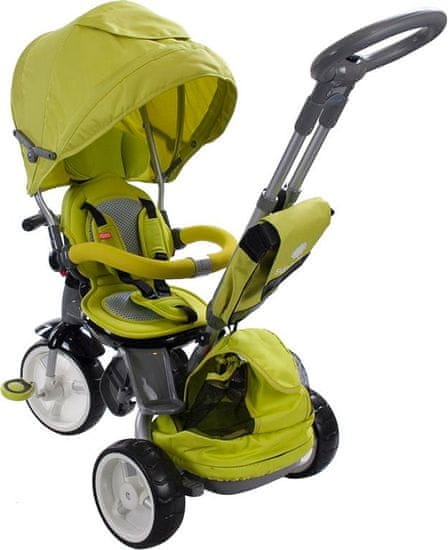 Má bezpečnostné popruhy, zvonček, priestor na menší nákup, striešku, otočné sedadlo, brzda...