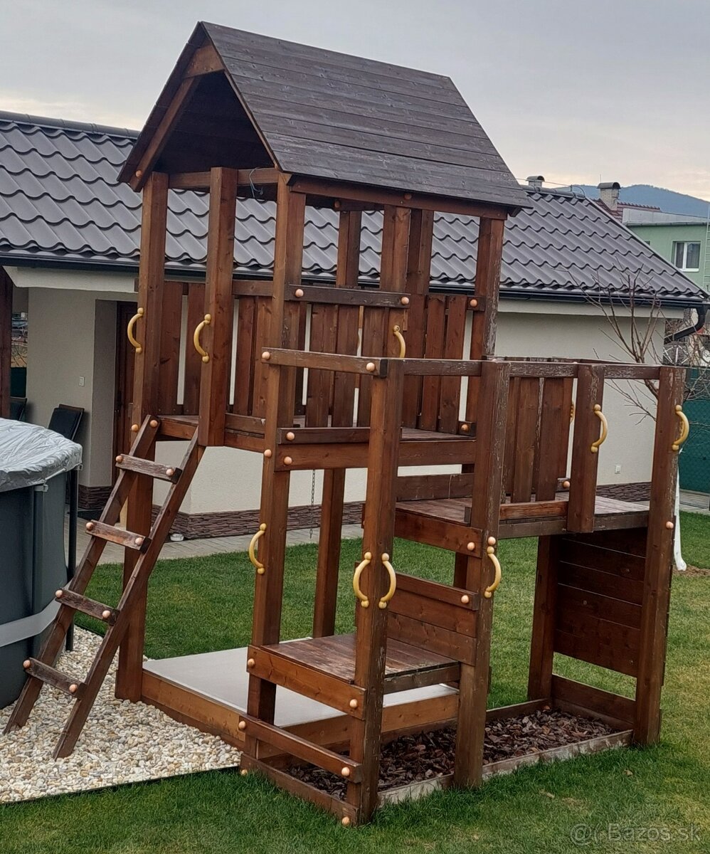 Predám záhradný drevený domček (hrad) pre deti „Blue Rabbit 2.0 @PENTHOUSE -1,5m“ používaný 3 sezóny. K domčeku je možné podľa potreby dokúpiť šmýkačku (KBT šmýkačka 3,0 m TSURI, alebo podľa vlastného výberu), ale na stránke webového predajcu je možné dokúpiť aj rôzne ďalšie príslušenstvo a rozšíriť ho o jednotlivé moduly, napríklad na hojdanie alebo lezenie.