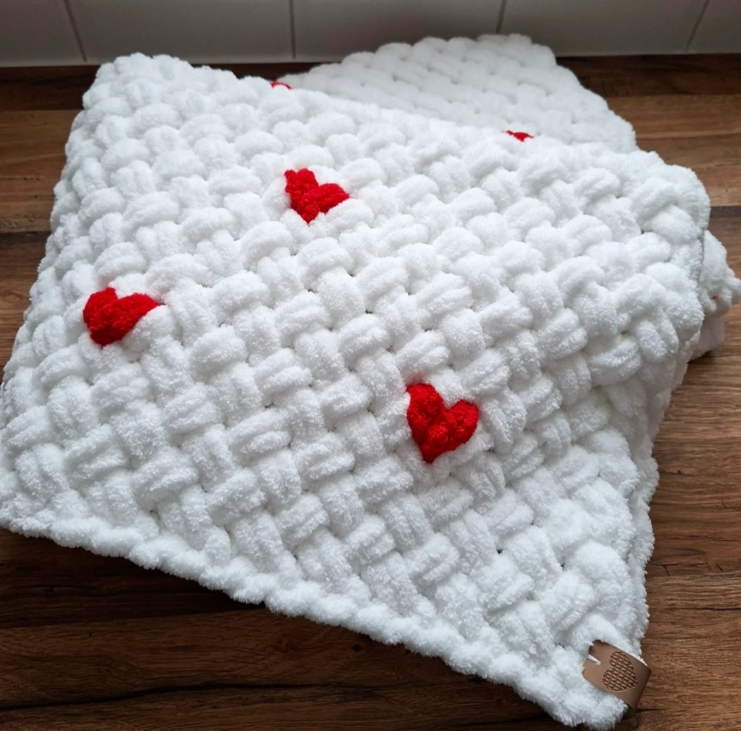 Úplne nová, ručne pletená puffy deka, so srdiečkovým vzorom.