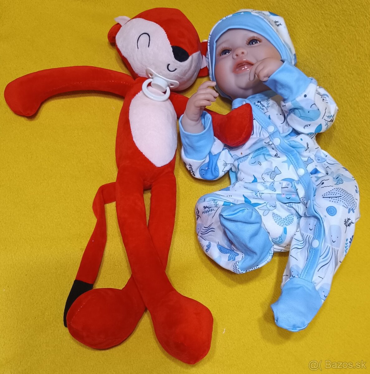 Na predaj realistický chlapec s pohlavím usmievavý Maxík 50cm. Celotelovy vinyl. Súčasťou je magnetický cumeľ, plienka, kojenecká fľaša, kombinéza, 2x čiapočka, body, nohavice, papučky, Darček naviac je veľká plyšová líška. Cena 64€