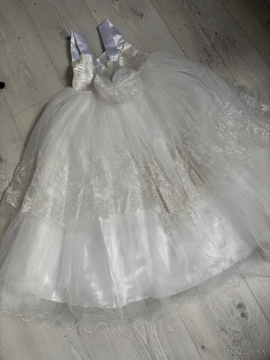 Slávnostné šaty pre družičku, veľkost. 92/98 - [25.1. 2026]Posuniem krásne slávnostne dievčenske šaty vo veľkosti 92/98, ale riadte sa rozmermi na fotke. Farba: biela ako na poslednej fotke. Saty 1x oblečené na 4 hodiny, bez poškodenia, jedina zmena voci novim je vzadu na viazaní, zo spodnej časti je čierna bodka. Šaty kupovane v KE na Mäsiarskej v špeciali ...
