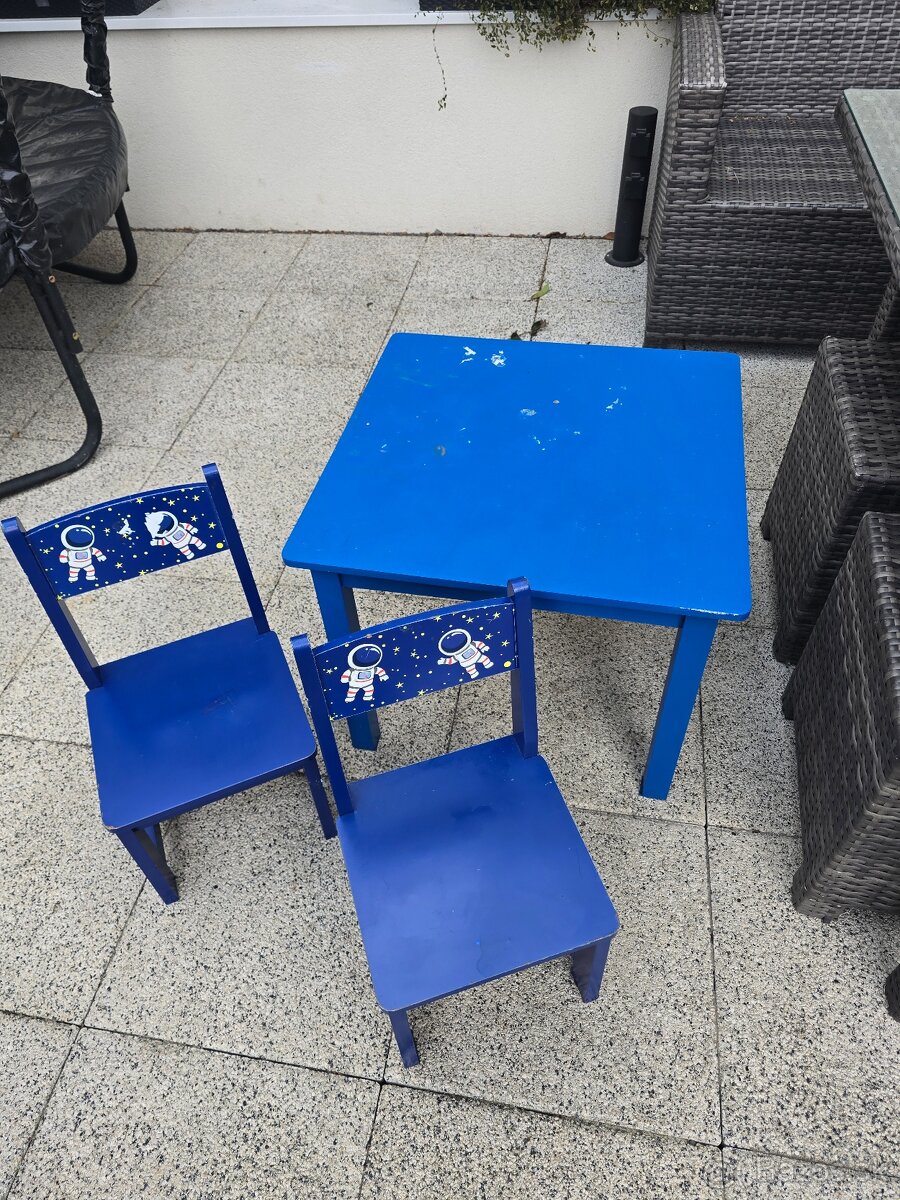 Detsky stol a stolicky - [8.2. 2026]Predam detsky stol a 2 stolicky, zachovale, pouzivane, klasicke opotrebenie viz foto. Stol rozmer 59x50cm a vyska 50cm.