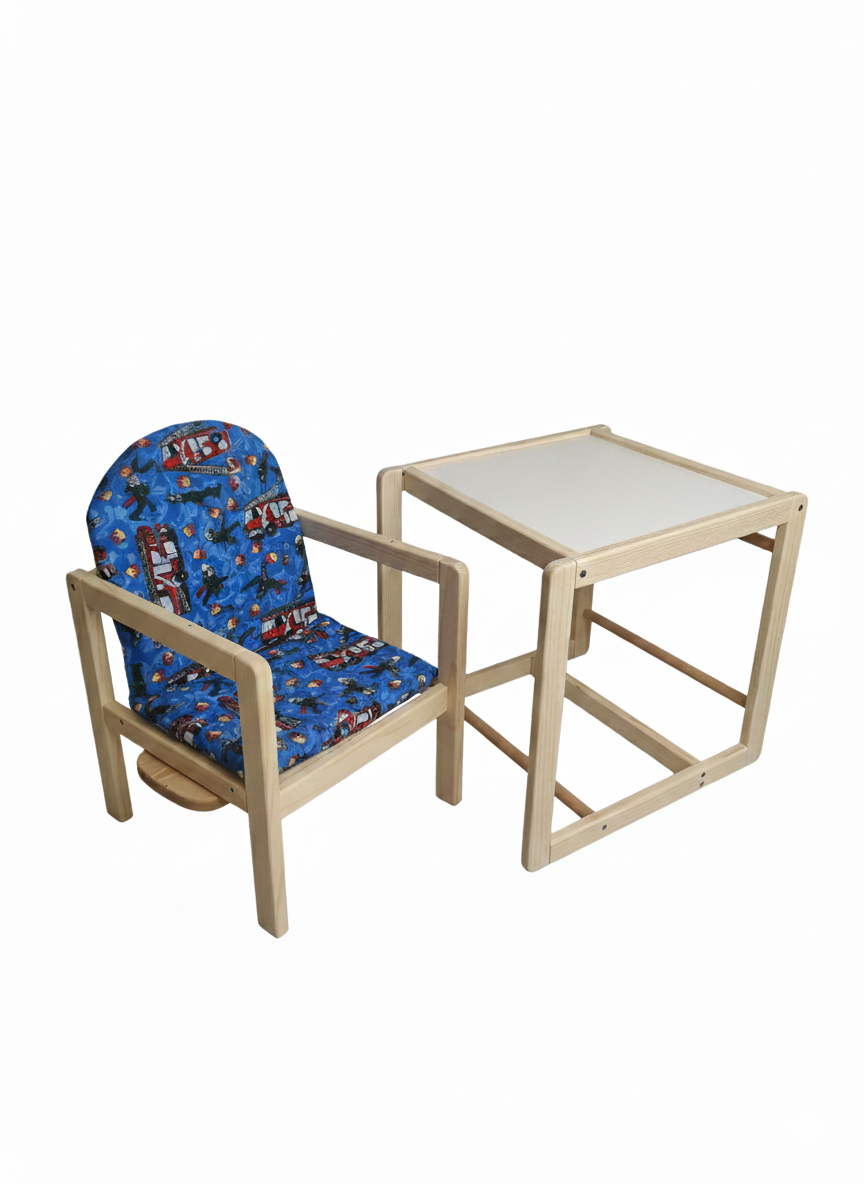 Detská drevená stolička je vhodná na kŕmenie detí pri jedálenskom stole alebo v rozloženom stave ako samostatný stolík a stolička na kreslenie, jedenie a hranie. Drevo je ošetrené lakom na detské hračky a nábytok. Poťah stoličky je k dispozícii vo viacerých farbách.