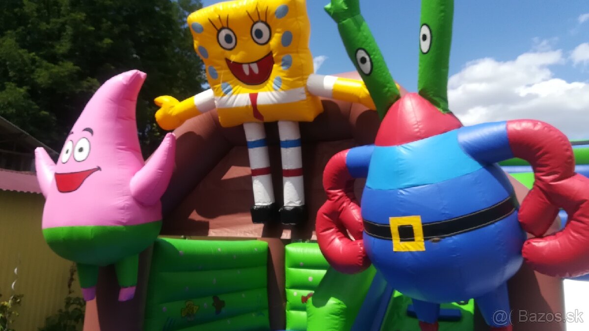 Ponúkam na prenájom skákací hrad SpongeBob, vhodný na rodinné oslavy a posedenia, rozmery 6m x 5m, z pevného materiálu, prosím volať na tel.číslo 0915335639. Cena dohodou.