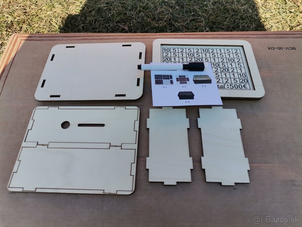 Predám drevenú pokladnicu. Úplne nová. Keďže je ešte nová nepoužitá treba si ju zložiť, je to veľmi jednoduché, je zo 6 dielov, zvládne zložiť každý- je k tomu aj návod na použitie, alebo na vyžiadanie zložím. Na prednej strane sú sumy ktoré treba do pokladnice vložiť aby ste tam nasporili výslednú sumu 500€. Súčasťou balenia je fixka s gumou, takže po vložení každej sumy jednoducho preškrtnete danú sumu, keď budú všetky sumy preškrtnuté bude vnútri 500€, po dosporení viete s gumou zmazať a môžete sporiť danú sumu aj opakovane. Originálny a praktický darček v jednom.