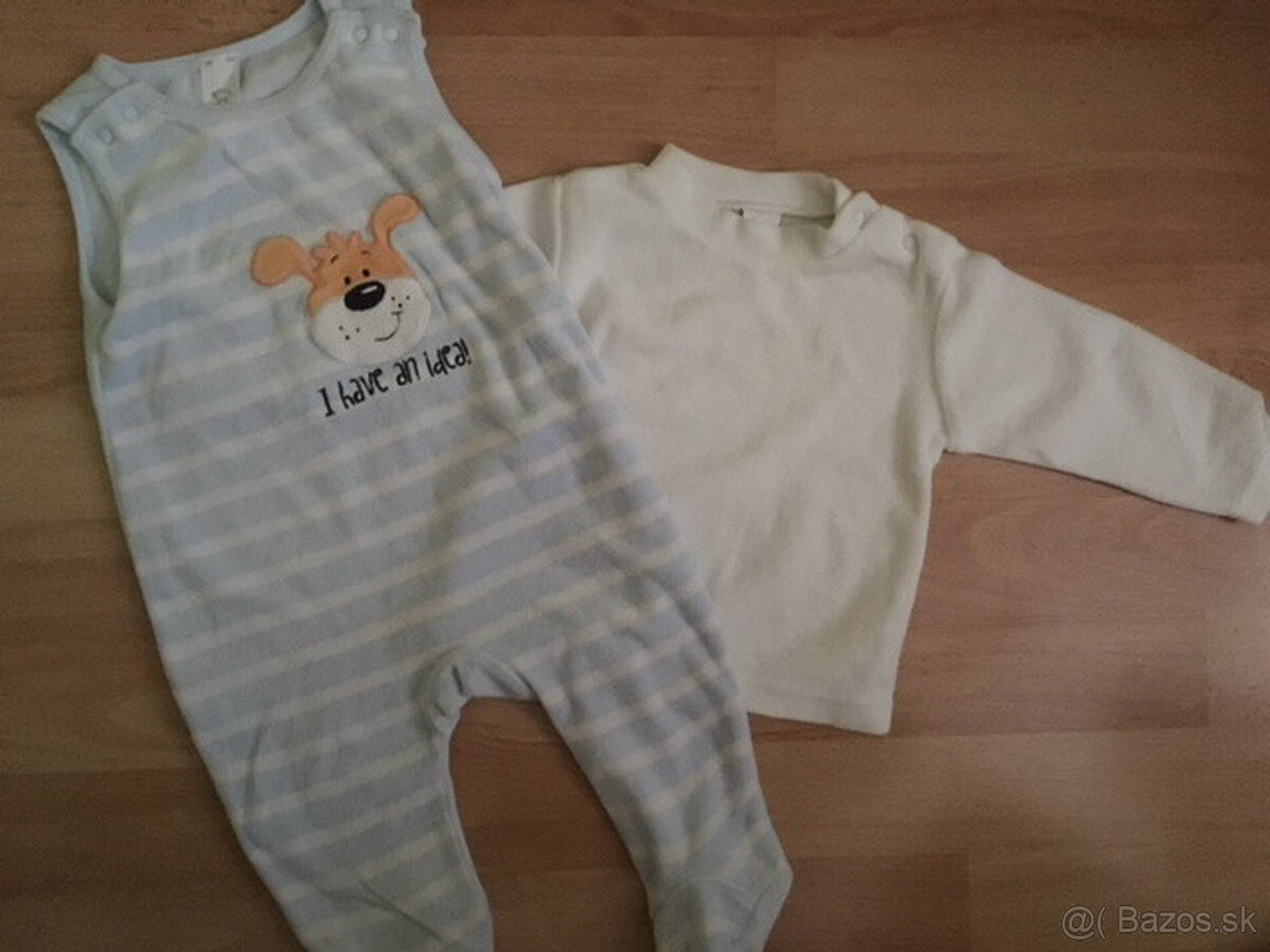 Velúrová súprava (dupačky s tričkom) pre chlapca, kúpená v C&A, veľkosť je uvedená 68, tričko má zapínanie na 2 cvočky, materiál: 76% bavlna, 24% polyester