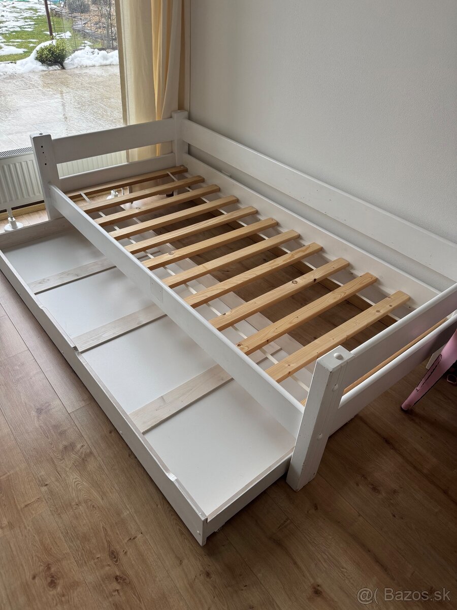 Predáme 2 postele s výsuvom bielej farby rozmer 90x200. Neodpovedame na emaily. Ak je záujem volať. Nôžky postele treba premalovat, a jednej postele spodný vysuv je trochu poškodení. Buď foto. Postele sa predávajú spolu.