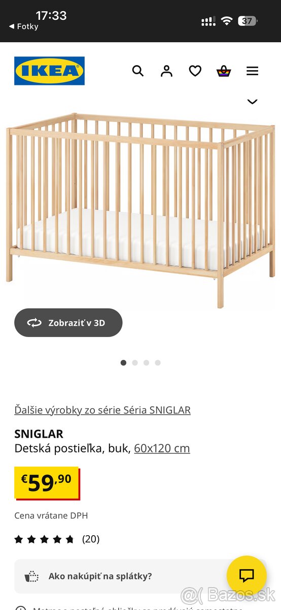 Predáme detskú postieľku Ikea Sniglar v 100% stave (minimálne používaná),ktorá bola využívaná sporadicky pri našej návšteve u rodičov. Veľkosť 60x120cm.
