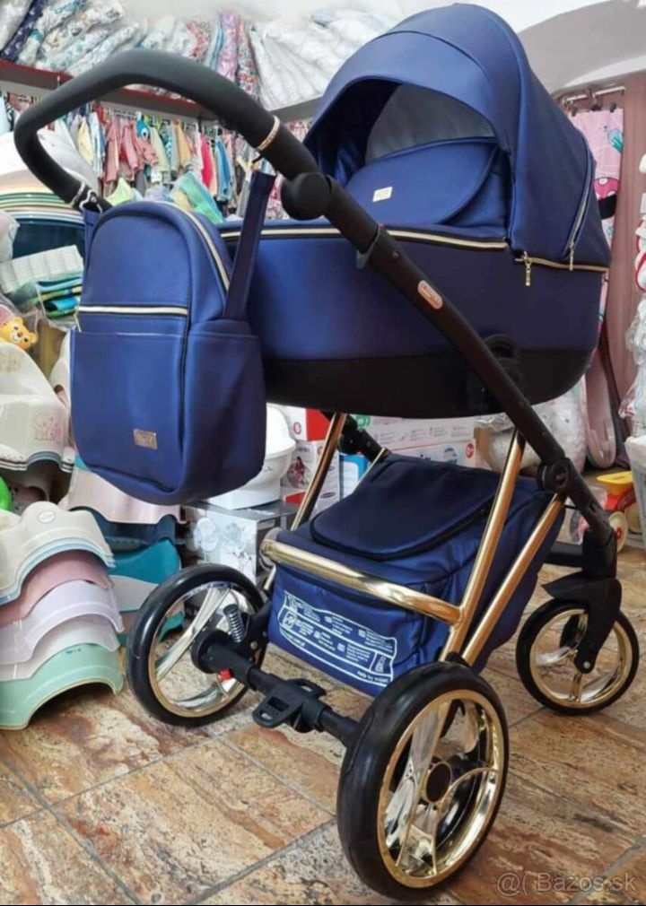Predám semišový kočík Adbor 3v1 v krásnej karamelovo-hnedej farbe s čierno-zlatou konštrukciou a kolesami. Pôsobí veľmi elegantne a luxusne.