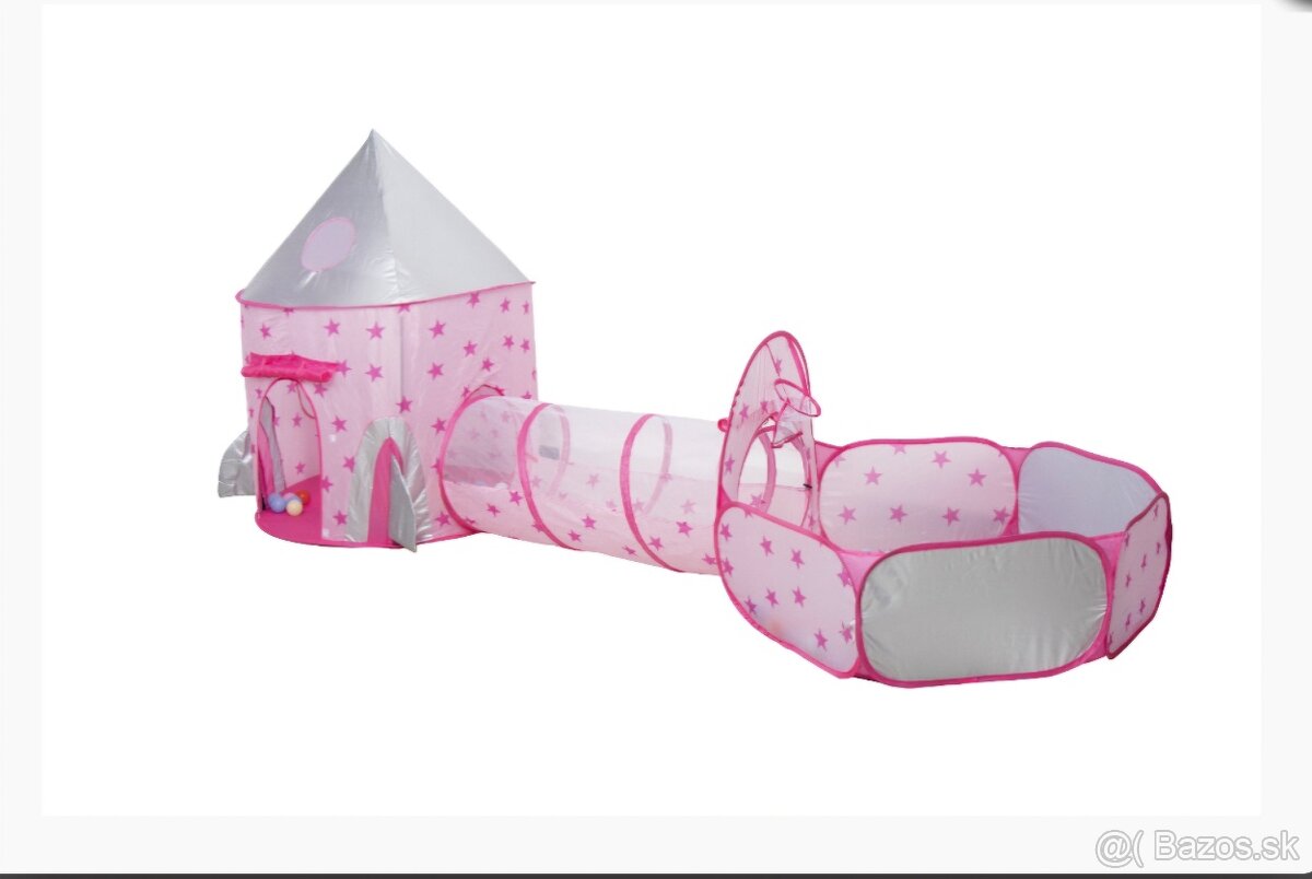 Rozmery: Teepee má priemer 105 cm a výšku 135 cm, tunel meria 46 x 120 cm a bazénik na loptičky má rozmery 120 x 36 x 72 cm. Nové, nepoužité