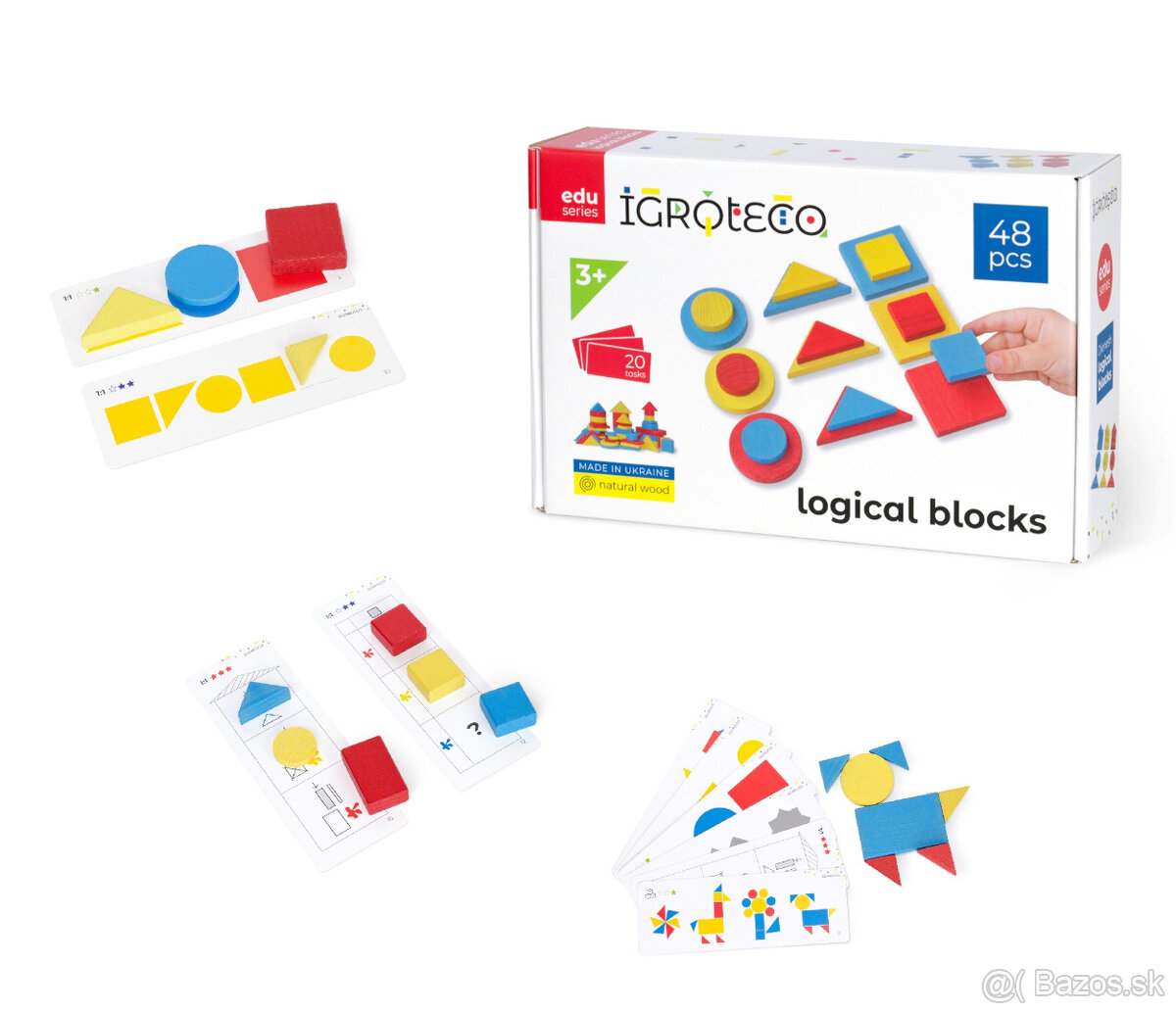 Obsahuje 48 farebných drevených blokov rôznych tvarov a veľkostí a 20 kartičiek s úlohami rôznej náročnosti.