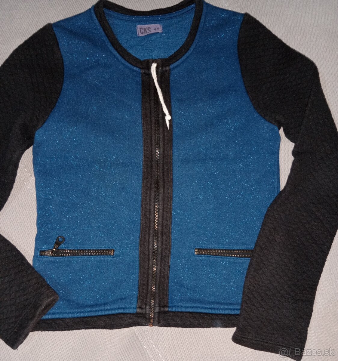 Predám dievčenskú mikinu zn. CKS na zips, tmavomodrá, jemne trblietavá, rukávy v čiernej farbe, vpredu vrecká na zips, materiál bavlna 70%, polyester 30%. Dĺžka mikiny cca 50 cm, dĺžka rukáva 58cm, vnútorná dĺžka 46cm. Zachovalá po jednom dieťati, kúpená v zahraničí. Cena 3€+poštovné. Info na mail, nie sms.