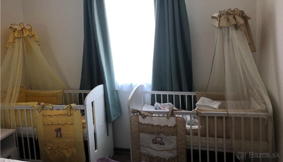 Posuvame dalej postielky.. Sucastou je matrac, plachta na matrac, baldachyn, tyc na baldachyn, a latkove mantineli. Na jednej strane su odnimatelne tri tyce. Vyska rostu je nastavitelna podla toho ako babatko rastie. Cena jednej je 60 eur. Osobny odber BA Aupark,ale Hainburg. Ale v pripade potreby by som mozno v ramci BA vedela dorucit. Dodatocne posuniem zadarmo bud kolotoc nad postielku alebo kresielko Joie( podla vlastneho vyberu). Foto poslem v pripade zaujmu.