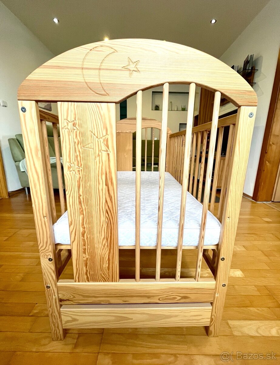 Detská drevená postieľka (120 x 60 cm) s kokosovým matracom (hrúbka 8 cm). Výškovo nastaviteľná do 3 polôh. Dve tyčky sa dajú vybrať, keď dieťa vyrastie, vie samo vyliezať a vliezať do postieľky.