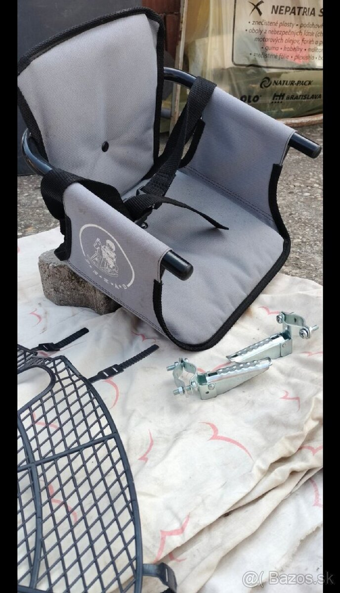 Predám detskú cyklo sedačku na pánsky bycikel,do 5-6 rokov.Syn mal 6r.mal výšku 1,20 a v pohode sa tam zmestil.Pridám aj stupačky na nôžky a sieťku na predné koleso.Predám aj detské pomocné kolieska na veľkosť bicykla 20 až 24-je to nastaviteľné.Priemer kolieska je 125 mm.Pevná konštrukcia a kolieska nie sú ošúchané, nakoľko sa syn naučil po 5km bicyklovať