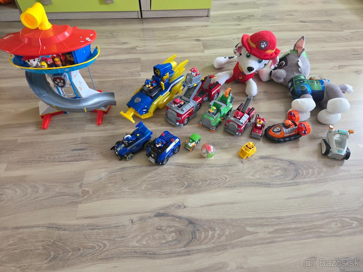 Predám všetko čo je na foto. Veža hrá, autíčka sú funkčné - chase- svieti, bliká, vydáva zvuky. Marshal- strieka vodu (vystrelovacie modré šípky) a auto je rozkladatelné.