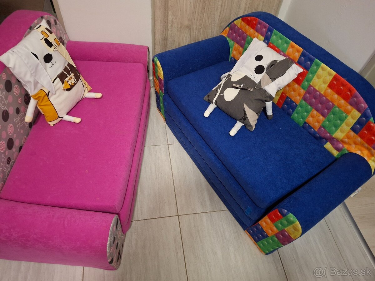Predám tieto nevyužité gauča pre deti ,bez škôd, deti ich už nevyužili modrý aj ružový dokonca aj s rozťahovacou časťou na spanie... pc-75euro,spoločná kúpa oboch za 80 ,ešte ich aj operiem¹,nevysedene ,plus k ružovemu gauču ružový poštár pod nohy,k modremu malý modrý poštár( není na fotke) psie poštáre niesu na predaj...budeme radi ak sa využijú a spravia radosť, rozťahovacia časť má asi okolo 150cm