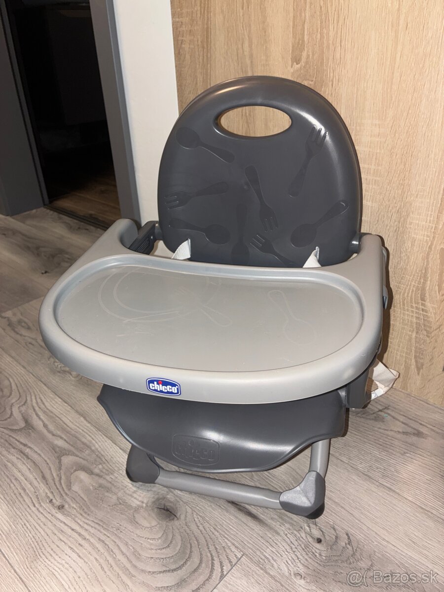 Prenosná detska jedalenska stolicka značky chicco. Párkrát použitá. Ľahká, skladacia, vhodná na dovolenky, ku rodičom. Dá sa pripevniť aj k veľkej jedálenskej stoličke, alebo samostatne postaviť.
